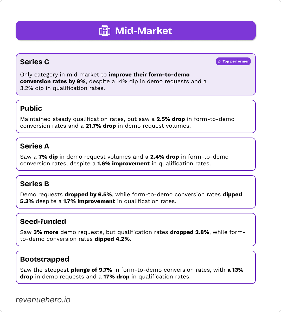 - Series C mid-market improved form-to-demo conversion rates by 9%, while Bootstrapped companies saw the steepest decline.