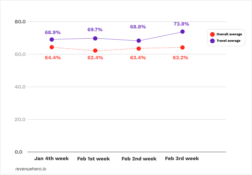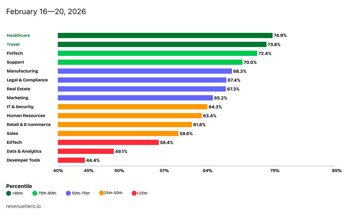 • Healthcare (74.9%) and Travel (73.9%) led above the 90th percentile, with Financial & Accounting slipping but staying top-tier.