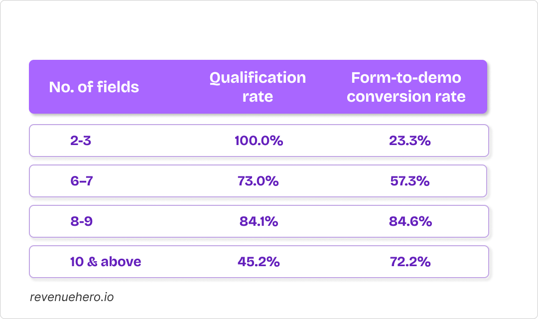 Upon adding a few more fields (company name, region based in, no. of locations, job title), the qualifying slightly strengthens, as evidenced by the data. This reaches its optimum for both qualification and form-to-demo conversion at 8–9 fields.