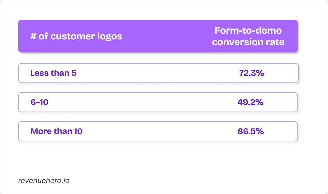 Logos help in pattern recognition. Your prospects need to see proof that you’ve solved similar business use cases before, and under 10 logos, you’re forcing them to make that leap.