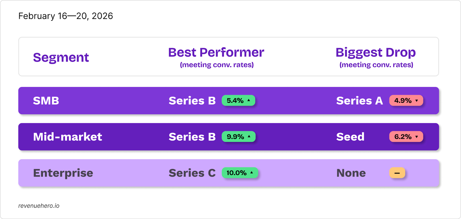 • Enterprise's Series C led with a 10% meeting rate jump, with all enterprise cohorts maintaining stable-to-improving conversion rates overall.