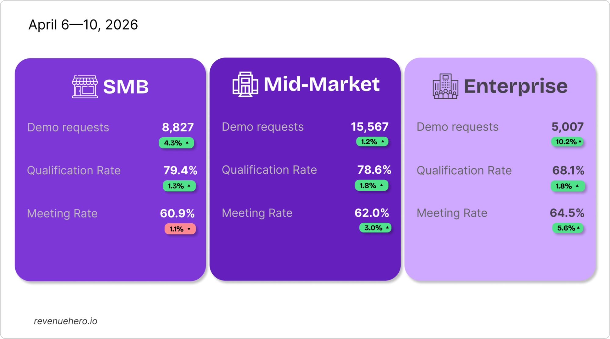 Enterprise witnessed the best opening week for Q2: with a 10.2% increase in demo request volumes, a 1.8% uptick in qualification rates, and a 5.6% surge in form-to-demo conversion rates that put its average ahead of the other two segments at 64.5%.