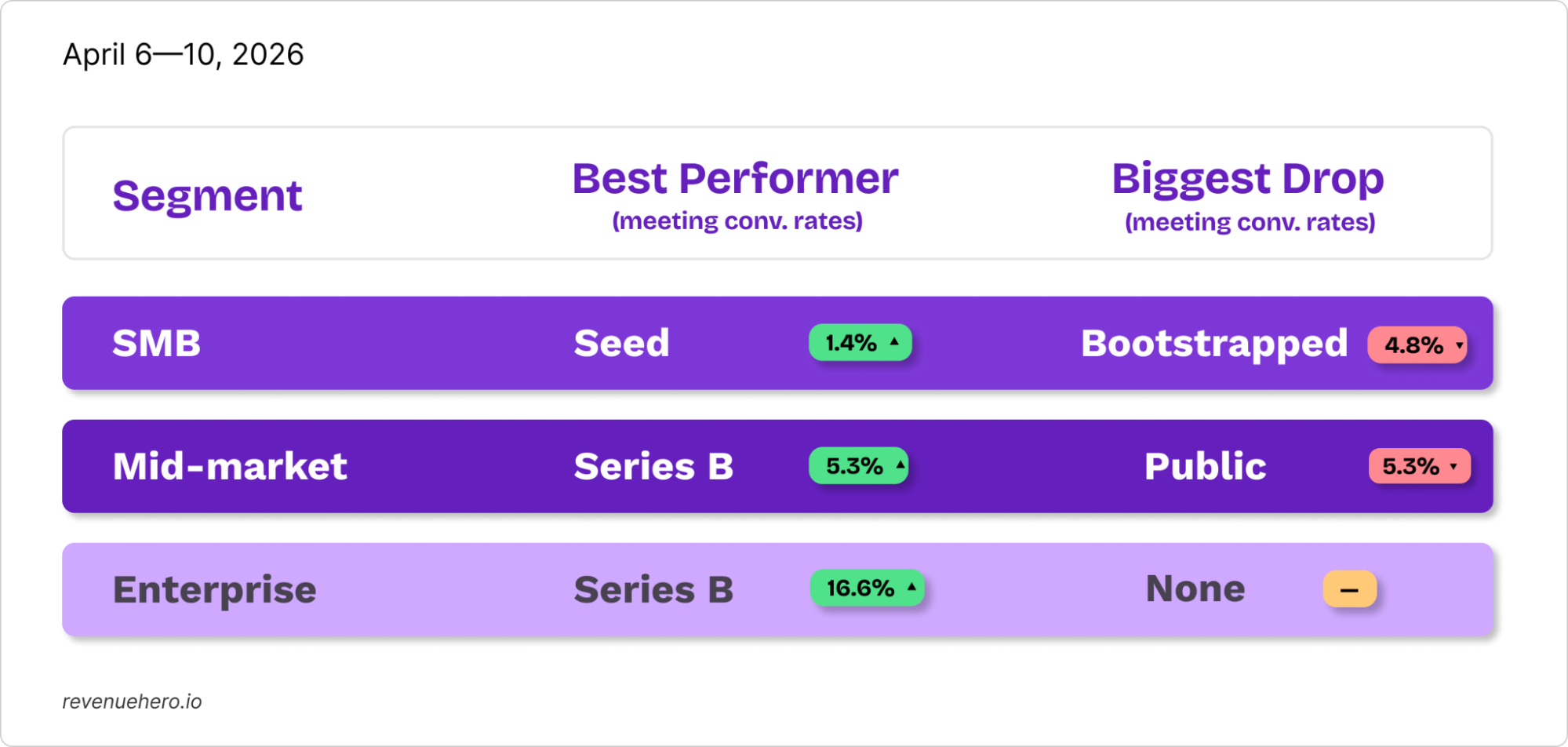 - Enterprise was the breakout segment: Demo requests soared +10.2% to 5,007, the biggest single-segment volume jump of Q2 so far. Meeting rates jumped +5.6% to 64.5%, the highest Enterprise reading in the dataset.