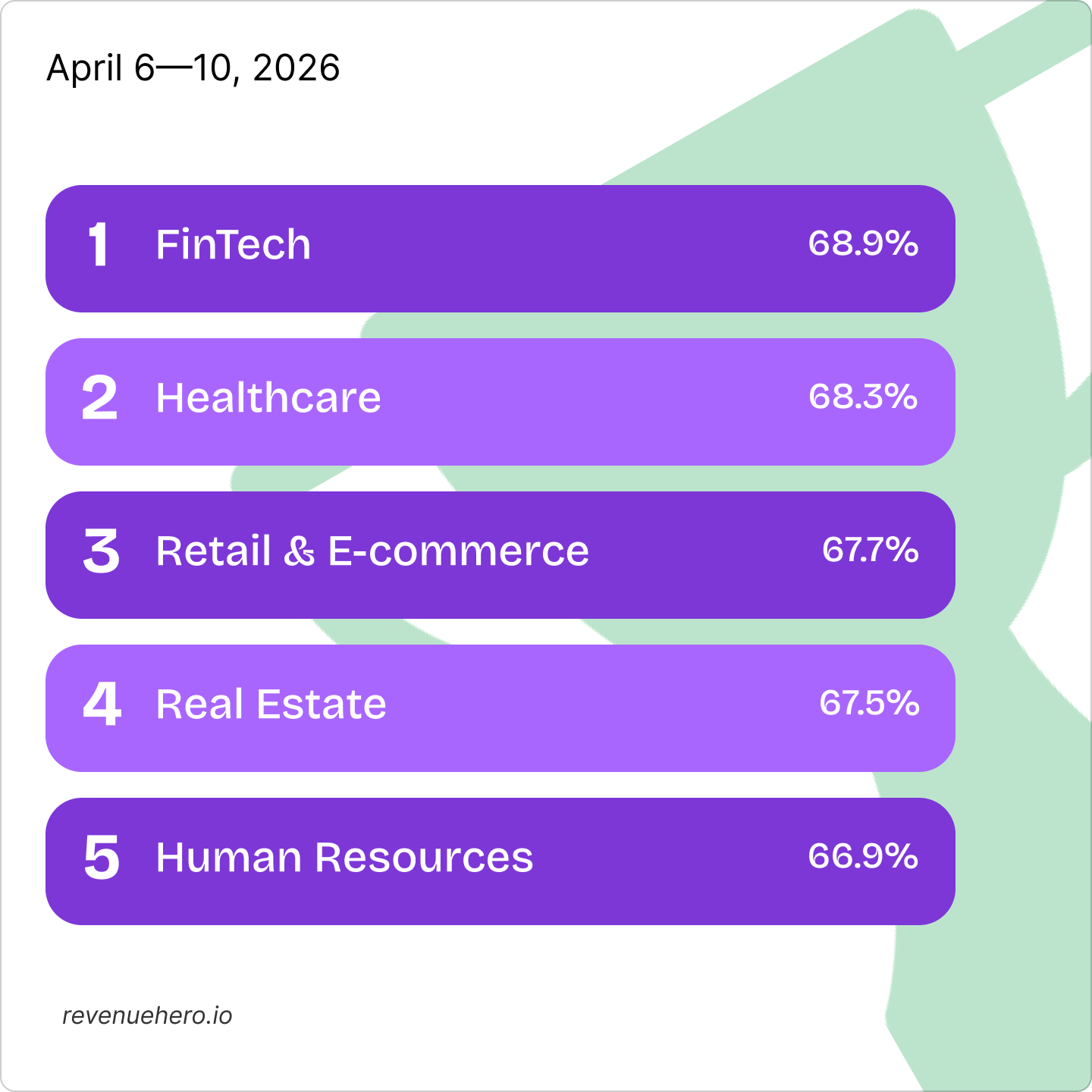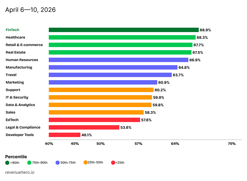 FinTech reclaimed the #1 spot from healthcare with an average form-to-demo conversion rate of 68.9%, which missed the top spot by a whisker (0.6%). Retail & e-commerce completed the podium with a conversion rate of 67.7%.