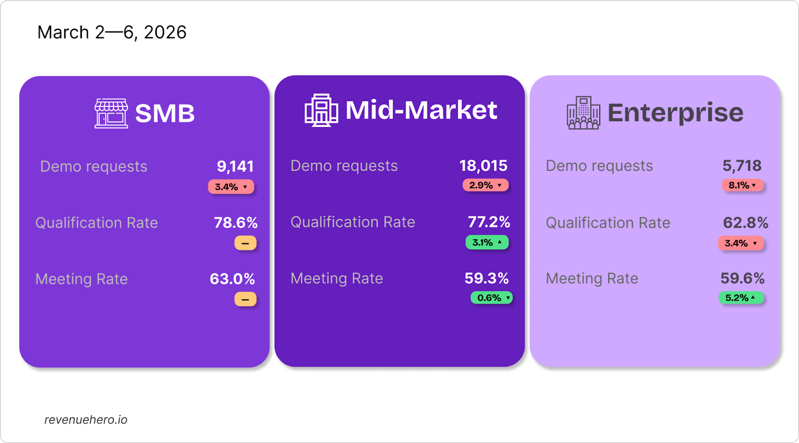 Mid-market inched forward, with qualification rates rising 3.1% and conversions holding steady. And Enterprise, despite the sharpest volume drop, actually improved form-to-demo conversion rates by 5.2%, the biggest funnel efficiency gain of the three.