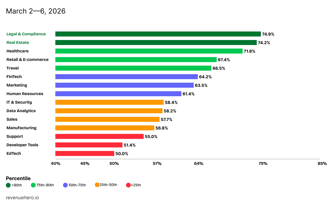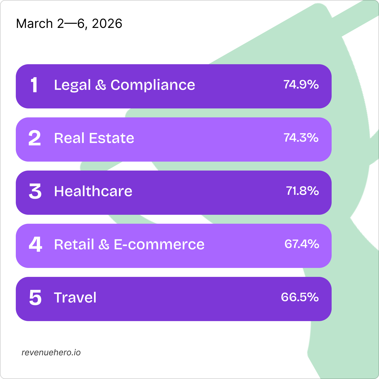 - Biggest wins: Real Estate (74.2%, +14.1%), Retail & E-commerce (+7.9%), and Legal & Compliance (+6.6%).