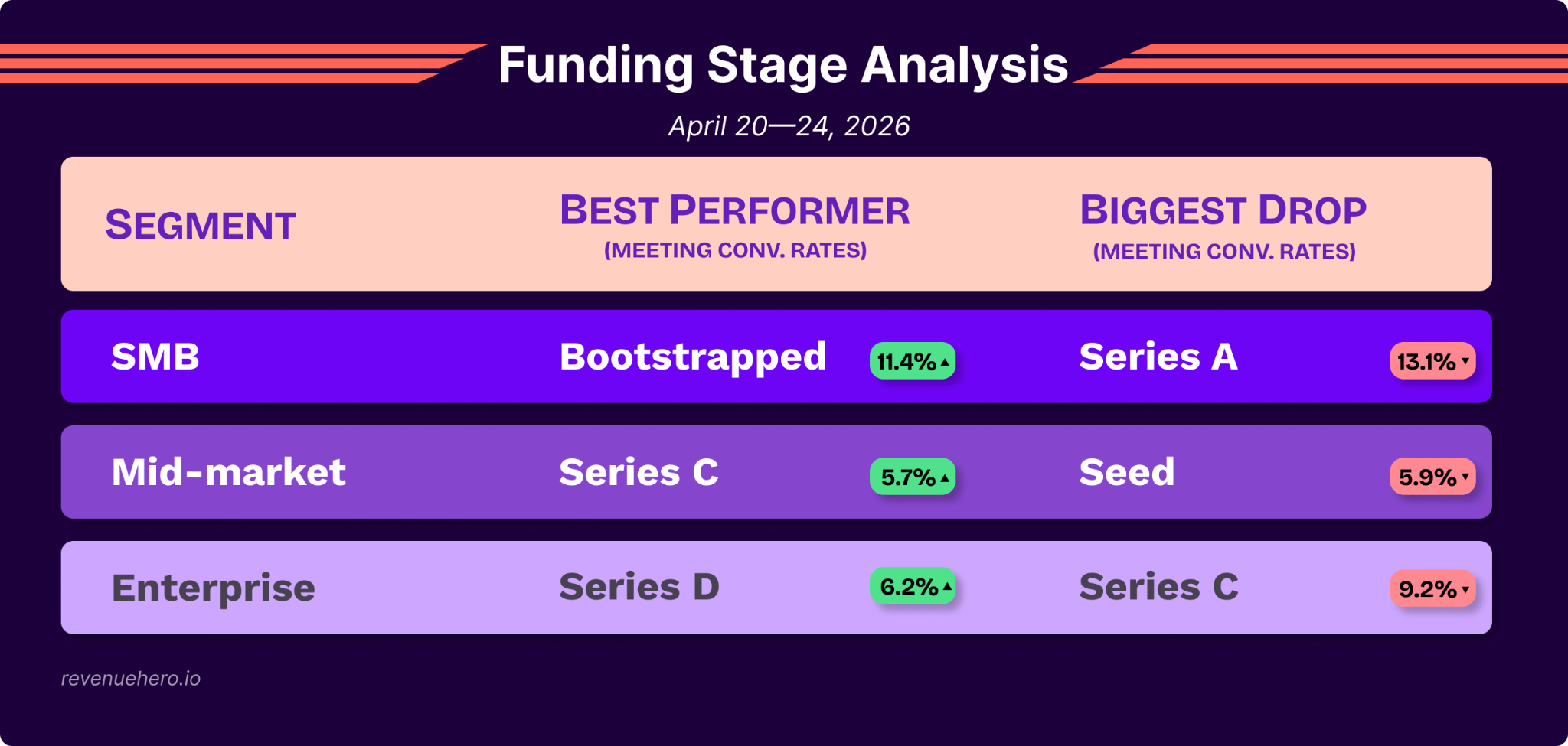 On the other end, SMB Series A plummeted 13.1% to 55%, the steepest decline across segments and funding stages. Mid-market seed companies saw a 5.9% drop, while meeting conversion rates plunged by 9.2% for enterprise Series C companies.