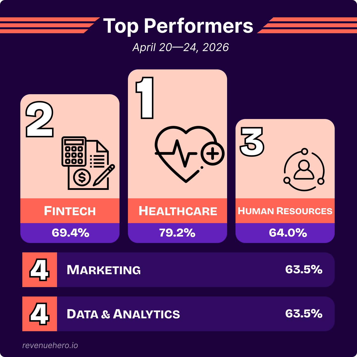 Healthcare grabbed the crown for the eighth time, splitting the gap between #1 and #2 by a whopping widened the gap between the #1 and #2 spots by 9.8%. Fintech came in second with 69.4%, while human resources took the third place with 64.0%, completing the podium.