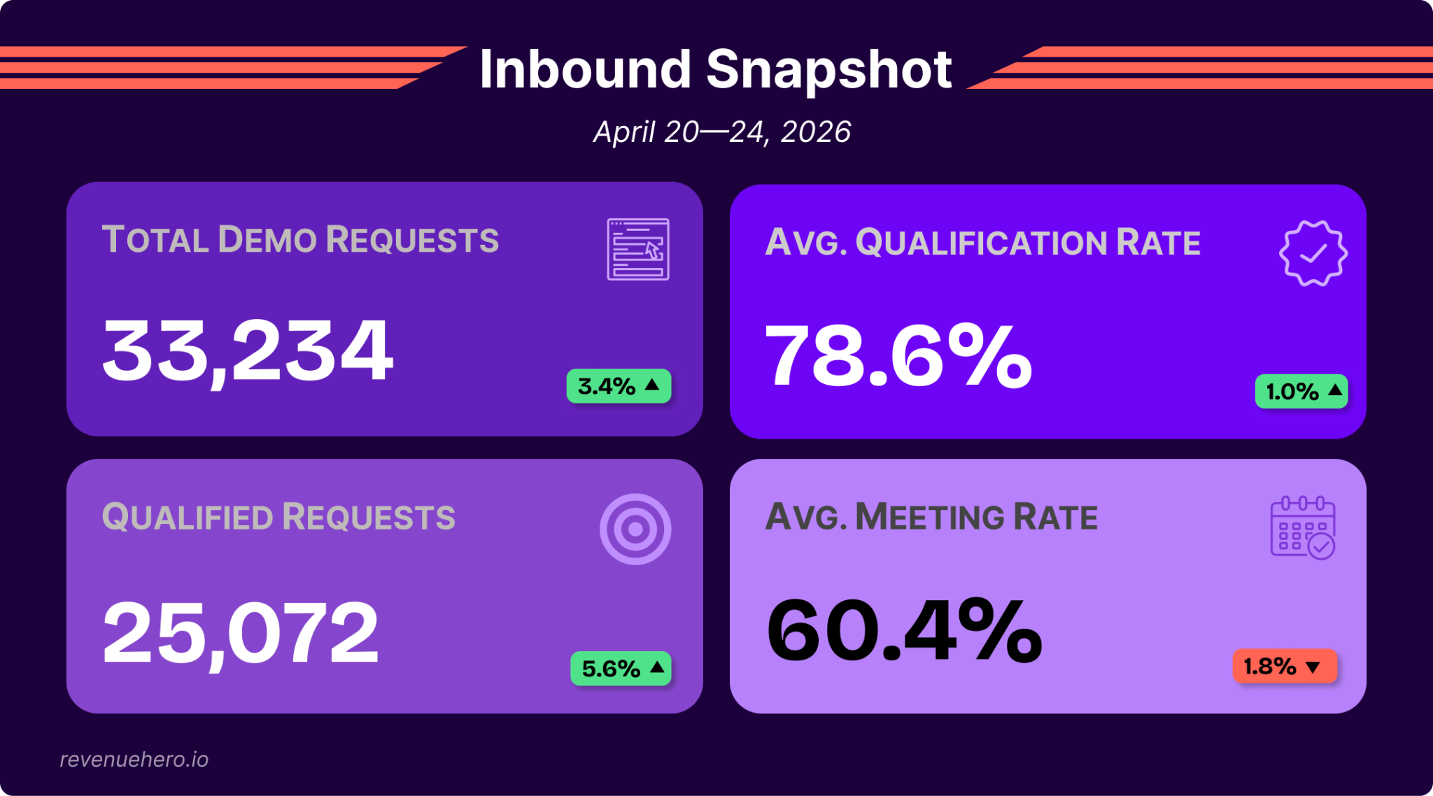 - Volume grew for the third straight week: Demo requests rose 3.4% to 33,234 and qualified requests jumped 5.6% to 25,072. Form-to-demo conversion rates ticked down 1.8% to 60.4%, ending the two-week uptrend.