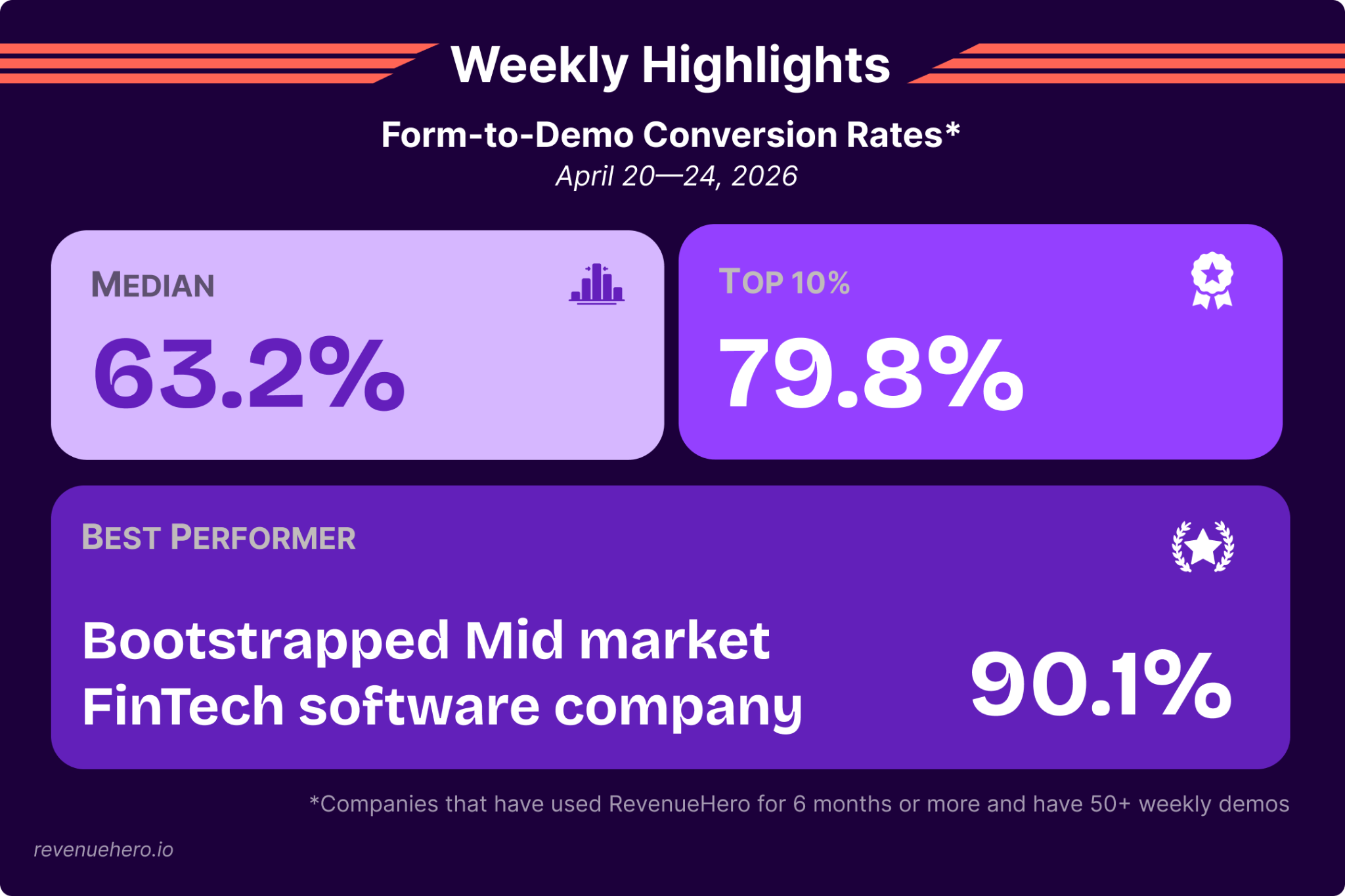 Last week’s best performer was also a fintech company (coincidence? 🤯): a bootstrapped mid-market company that DQ'd 39% of its demo requests and converted 90.1% of the qualified leads into meetings, the highest form-to-demo conversion rate across all eligible companies* this week.